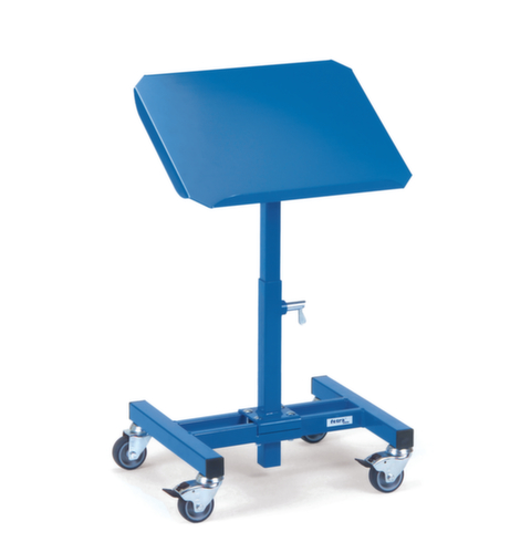 platform van staal, met steunrand. staalconstructie, gelast. onderstel met slag- en krasvaste poedercoating in RAL5007 briljantblauw. hoogte 755 - 1105 mm. niveaus per 25 mm verstelbaar. Gemakkelijk te manoeuvreren en verrijden door 4 zwenkwielen, remmen op twee zwenkwielen zorgen altijd voor een stevige stand. wiel Ø 75 mm. met vloervriendelijke TPE-banden. wielnaaf met schok- en corrosiebestendig glijlager. wielstand rechthoekig.