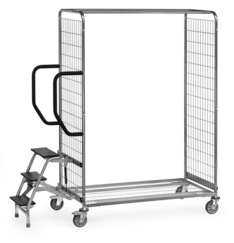 "longDescription": "<h2>Ladder voor orderverzameltrolley</h2><ul><li>Veilig staan onder belasting</li><li>Geen kantelen van de trolley dankzij vergrendelingsmechanisme</li><li>Gemakkelijk in te klappen dankzij de gasdrukcilinder</li><li>Ongevallenvrij op- en afstappen - treden met antislip ribbels</li><li>Frame van stalen buizen en houten treden (bovenste trede 600 mm hoog, werkhoogte tot ca. 2,8 m)</li><li>Bijpassende handgrepen - inclusief extra uitstekende ski-handgrepen om vast te houden en om tegenaan te leunen (trolleylengte plus 100 mm)</li></ul>",