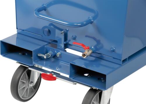 Het kiepen gaat gemakkelijk handmatig via een hendel aan de achterzijde. De kantelbeveiliging zorgt ervoor dat de bak tijdens het transport niet onbedoeld kantelt. De bak is oliedicht gelast. Opgevangen vloeistoffen, zoals olie of water, worden door een zeef van de vaste stoffen gescheiden en kunnen met een kraan worden afgetapt zonder de container te kantelen. Hierdoor wordt veel tijd bespaard. Hoge stabiliteit door omgeslagen randversteviging rondom. Robuuste constructie van staal met slag- en krasvaste poedercoating in RAL5007 briljantblauw. Wielen en vorksloffen garanderen gemakkelijk transport en oppakken met een vorkheftruck voor het legen over een container. Door 2 zwenk- en 2 bokwielen en duwbeugel is de kiepwagen gemakkelijk naar de gewenste plaats van toepassing te rijden. De vloervriendelijke TPE-banden laten geen sporen achter. Ze hebben bovendien een lage weerstand bij op gang komen en lopen aangenaam lang na. Dit bespaart kracht bij het duwen en trekken. wielnaaf met lichtlopende en onderhoudsvrije groefkogellager. zwenkwielen met centraal remsysteem TOTALSTOP.