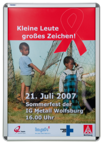 "longDescription": "<h2>Klik frame</h2><strong>Informatie goed beschermd presenteren</strong><br><ul><li><strong>modern design</strong> - frame van zilverkleurig geanodiseerd aluminium met glanzende, afgeronde kunststof hoeken</li><li><strong>vrij zicht</strong> door antireflecterende folie</li><li><strong>geeft stabiliteit</strong> - achterwand van polystyreen</li><li><strong>past op elke wand</strong> - staand of liggend te monteren</li></ul><br>Deze elegante lijst is bij uitstek geschikt voor de presentatie van informatie en aankondigingen, voor bedrijfsportretten of voor speciale fotoshoots binnenshuis. Met de klemprofieltechnologie kunt u de inhoud snel en gemakkelijk veranderen. Het frame is gemaakt van zilverkleurig geanodiseerd aluminium met glanzende kunststof hoeken.<br><br>Dankzij de antireflecterende beschermfolie zijn uw mededelingen ook bij ongunstig licht goed zichtbaar. Bovendien is de film voorzien van een UV-filter, dat de inhoud beschermt tegen verbleken. De achterwand van dit clip-on frame is gemaakt van stevig polystyreen.<br><br><strong>Goed om te weten!</strong><br>U kunt de lijst in staand en liggend formaat ophangen. Voor de wandmontage heeft u schroeven en pluggen nodig (niet meegeleverd).<br>",