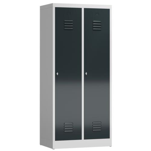 per vak 1 hoedenplank en 1 kledingstang met 4 dubbele haken. openslaande deur met ventilatiesleuven. afsluitbaar met klinksluiting voor hangslot. elk vak apart afsluitbaar. De sokkel onder de kast zorgt ervoor dat het gewicht van de kast gelijkmatig over de vloer wordt verdeeld. Hierdoor staat de kast stabieler en kan hij zwaardere lasten dragen dan een kast met voeten. En omdat er geen vuil, stof en vocht onder kan komen, hoeft er onder de kast niet te worden schoongemaakt. constructie van staal, gelast. romp met elektrostatische poedercoating in RAL7035 lichtgrijs, front met elektrostatische poedercoating in RAL7016 antracietgrijs.