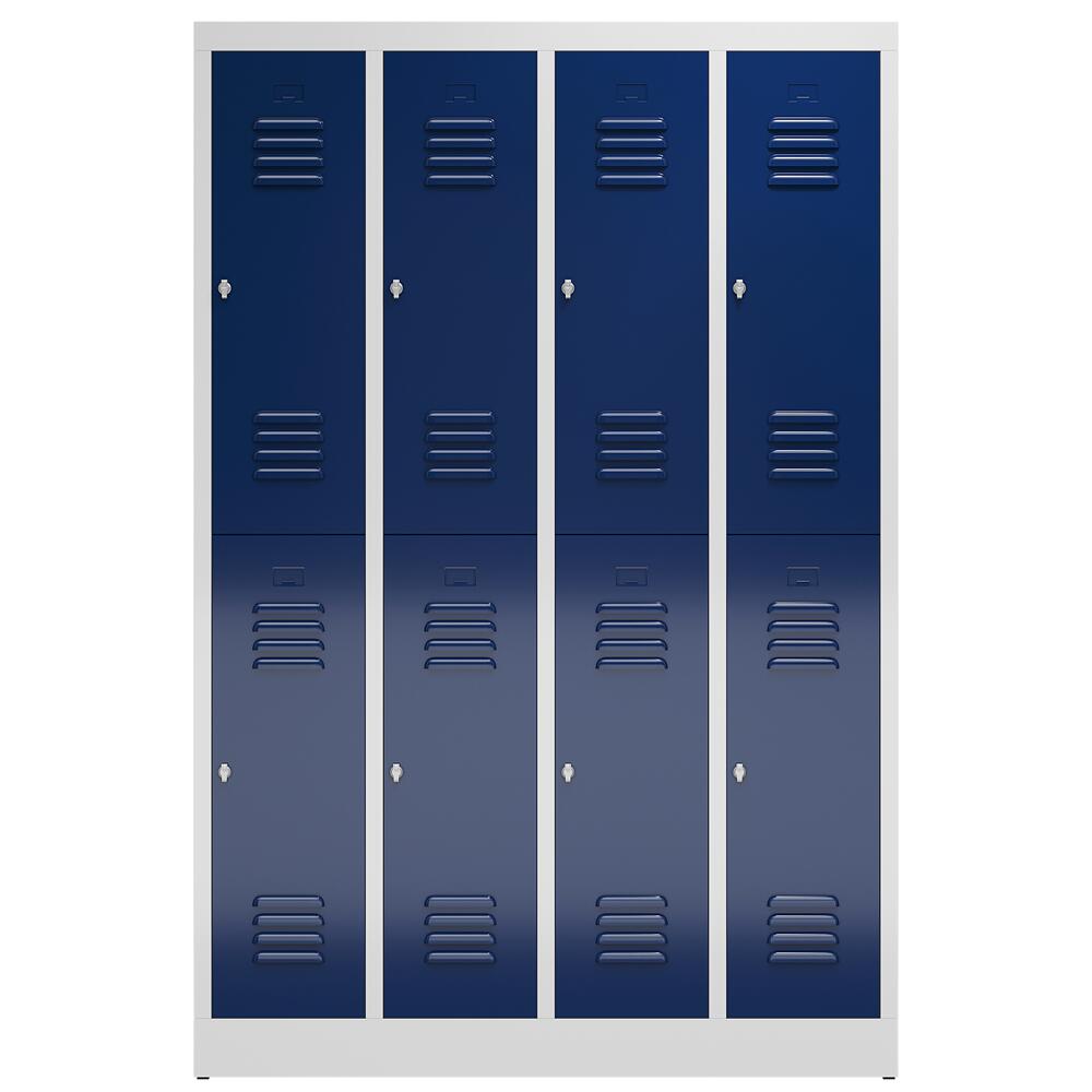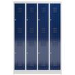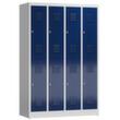 per vak 1 kledingstang en 2 dubbele haken per vak. openslaande deur met ventilatiesleuven. afsluitbaar met klinksluiting voor hangslot. elk vak apart afsluitbaar. De sokkel onder de kast zorgt ervoor dat het gewicht van de kast gelijkmatig over de vloer wordt verdeeld. Hierdoor staat de kast stabieler en kan hij zwaardere lasten dragen dan een kast met voeten. En omdat er geen vuil, stof en vocht onder kan komen, hoeft er onder de kast niet te worden schoongemaakt. constructie van staal, gelast. romp met elektrostatische poedercoating in RAL7035 lichtgrijs, front met elektrostatische poedercoating in RAL5010 gentiaanblauw.