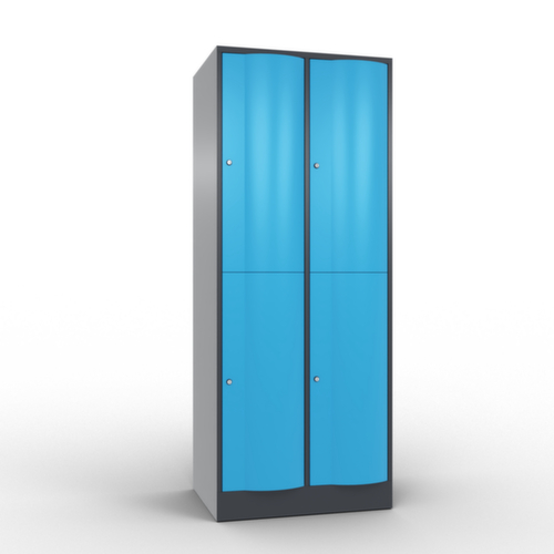 De naar voren gewelfde openslaande deur is absoluut stabiel en vandalismebestendig, zelfs tegen trappen. De enkelwerkende opdekdeuren zijn opgehangen aan robuuste, interne espagnoletscharnieren en dus bestand tegen zware belastingen. Elke deur is standaard uitgerust met een systeem voor gedempte sluiting , zodat de deur niet dichtslaat, zelfs niet wanneer deze een krachtige duw krijgt. Dit draagt niet alleen bij aan een rustigere werkomgeving, maar beschermt de stalen kast ook tegen beschadiging. Bovendien beschermt de deuropeningsbegrenzer tegen te ver openen van de deur en tegen overlapping van de bruikbare ruimte met de naastgelegen kast. afsluitbaar met cilinderslot. De ventilatieopeningen in de achterwand zorgen voor een goede luchtcirculatie in elk kastvak. Door de afdekplaat kan de bijzetkast worden gebruikt als extra werk- of aflegoppervlak. De sokkel onder de kast zorgt ervoor dat het gewicht van de kast gelijkmatig over de vloer wordt verdeeld. Hierdoor staat de kast stabieler en kan hij zwaardere lasten dragen dan een kast met voeten. En omdat er geen vuil, stof en vocht onder kan komen, hoeft er onder de kast niet te worden schoongemaakt. constructie van plaatstaal, gelast. romp met moffellak. front met moffellak.