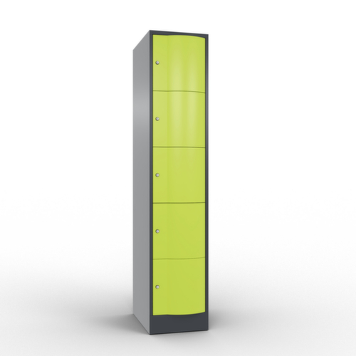De naar voren gewelfde openslaande deur is absoluut stabiel en vandalismebestendig, zelfs tegen trappen. De enkelwerkende opdekdeuren zijn opgehangen aan robuuste, interne espagnoletscharnieren en dus bestand tegen zware belastingen. Elke deur is standaard uitgerust met een systeem voor gedempte sluiting , zodat de deur niet dichtslaat, zelfs niet wanneer deze een krachtige duw krijgt. Dit draagt niet alleen bij aan een rustigere werkomgeving, maar beschermt de stalen kast ook tegen beschadiging. Bovendien beschermt de deuropeningsbegrenzer tegen te ver openen van de deur en tegen overlapping van de bruikbare ruimte met de naastgelegen kast. afsluitbaar met cilinderslot. De ventilatieopeningen in de achterwand zorgen voor een goede luchtcirculatie in elk kastvak. Door de afdekplaat kan de bijzetkast worden gebruikt als extra werk- of aflegoppervlak. De sokkel onder de kast zorgt ervoor dat het gewicht van de kast gelijkmatig over de vloer wordt verdeeld. Hierdoor staat de kast stabieler en kan hij zwaardere lasten dragen dan een kast met voeten. En omdat er geen vuil, stof en vocht onder kan komen, hoeft er onder de kast niet te worden schoongemaakt. constructie van plaatstaal, gelast. romp met moffellak. front met moffellak.