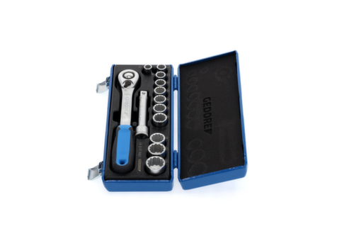"longDescription": "Met gesmede, geharde, handbediende zeskant UD profiel (nr. 19) of 12-punts UD profiel (nr. D 19) doppen, Met bedieningsgereedschap van vanadium staal 31CrV3, Met robuuste hefboomratel, met drukknopontgrendeling, In GEDORE blauw plaatstalen koffer, Afmetingen: 320 x 132 x 55 mm<br>",