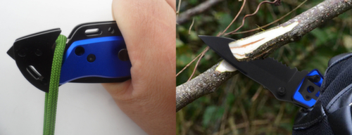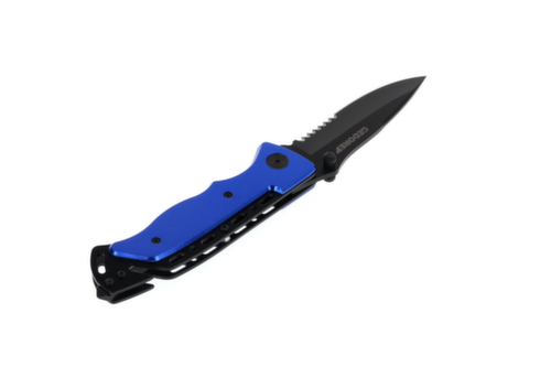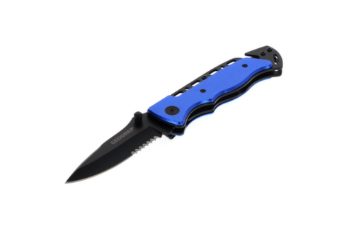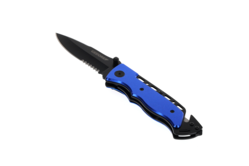 "longDescription": "Voor het snijden, scheiden en verdelen van een breed scala aan materialen, Hoogwaardig, universeel reddingsmes met extra bandsnijder en glasbreker, Universele helper in de auto, het huishouden, de tuin en de werkplaats, Gehard lemmet met gedeeltelijke zaagvertanding, Lemmet zwart, Handgreep blauw.<br>",