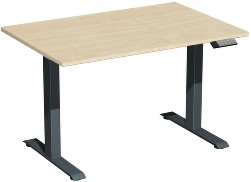 De belangrijkste afmetingen van het Gera bureau Elevate Basic in één oogopslag:blad van hout met onderhoudsvriendelijke melamineharscoating in decor esdoorn. plaatvorm hoekig. rand met slagvaste ABS-omranding ter bescherming tegen lelijke barsten en beschadigingen. T-voetonderstel van staal met slag- en krasvaste poedercoating in antraciet. Buisvorm vierkante buis. hoogteverstelling door elektromotor met handschakelaar. functies: Opslaan en automatisch oproepen van 3 geprogrammeerde tafelhoogtes dankzij memoryfunctie. De automatische botsingbescherming stopt onmiddellijk bij weerstand van boven of onder en zorgt zo voor absolute veiligheid. frame met stelschroeven. met USB-C-aansluiting voor het laden van mobiele apparaten. De voeten zijn met een traverse onder het blad verbonden. Zo wordt de algehele stabiliteit van de tafel verbeterd en doorbuigen van het blad voorkomen.