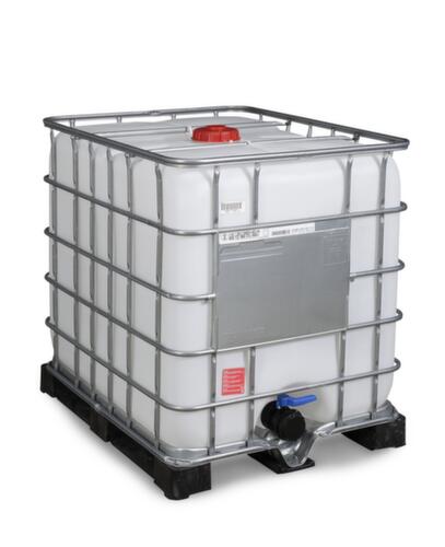 Voor correcte opslag aquatoxische en bijtende stoffen. Het oppervlak van de container is uv-gestabiliseerd, wat betekent dat het productiemateriaal zelf beschermd is tegen de schadelijke invloed van uv-licht. De veilige positie van de uitloopkraan nominale breedte 80, waarvan de inlaatopening extra is afgedicht met een aluminium PE-schijf, beschermt de inhoud en voorkomt lekkage. van hogedruk polyethyleen in transparant. met polyethyleenpallet. met schroefdeksel. afsluitbaar met zegel. door roosterframe stapelbaar.