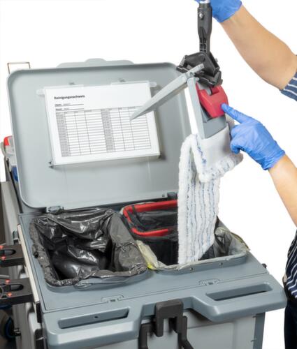 De gesloten servicewagen voldoet aan de strengste hygiënenormen voor dagelijks gebruik in de gezondheidszorg en horeca. Speciale afgesloten wielen, emmers, mopemmers en gladde en eenvoudig te reinigen oppervlakken zorgen ervoor dat de wagen zelfs onder de strengste hygiënevoorschriften kan worden ingezet. Zowel de verzorgings- als de afvalunit zijn voorzien van afsluitbare deuren. In de verzorgingsunit hebben 4 emmers een stabiele plek dankzij de verzonken plaats in een plat opvanglegbord. De 3 middelste opvanglegborden bieden voldoende opbergruimte voor reinigingsmiddelen en schoonmaakgerei. Als alternatief kunnen de opvanglegborden ook volledig worden verwijderd, de kast biedt dan voldoende ruimte om een stofzuiger op te bergen. De handgrepen van de emmers hebben verschillende kleuren en bieden door deze 4-kleurencodering de mogelijkheid om snel vast te stellen wat de juiste emmer voor een specifieke reiniging of ruimte is. Dit vermindert het risico op kruisbesmetting en het gebruik van verkeerde reinigingsmiddelen. De transparante, scharnierende deksels zorgen er bovendien voor dat er wordt voldaan aan strenge hygiënenormen. Met de meegeleverde bevestigingsbeugels voor vuilniszakken kan de afvalunit flexibel worden ontworpen, al naar gelang uw behoeften. Opstellingen met maximaal vier zakken van 35 liter of twee zakken van 70 liter zijn bijvoorbeeld mogelijk.. Ter beveiliging op openbare locaties kan men de kasten afsluiten d.m.v. uitneembare sleutels.