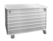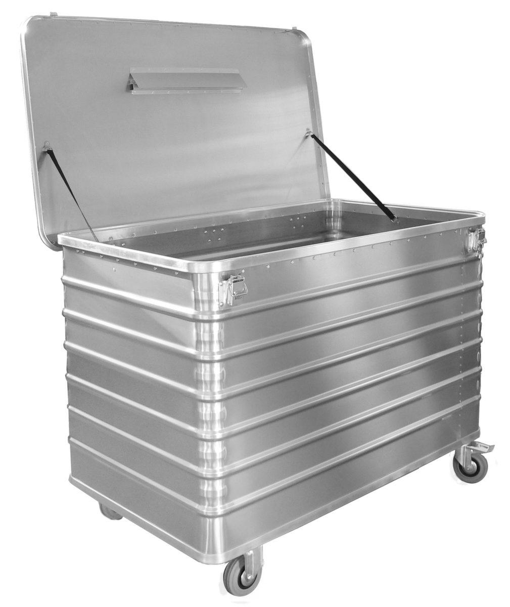 wanden met rondom lopende rillen. deksel scharnierend. aluminiumconstructie. 2 zwenk- en 2 bokwielen. wiel Ø 125 mm. met massief rubber-banden. wielnaaf met wiellager. wielen met draadvangkappen, zwenkwielen met rem. wielstand rechthoekig.