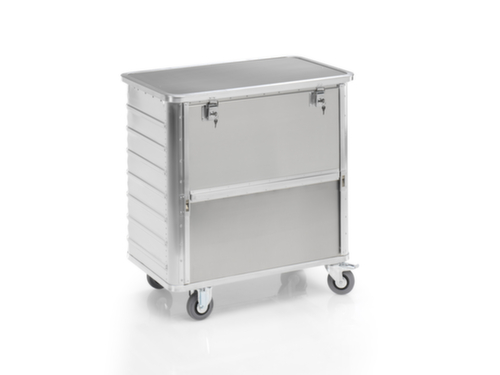 wanden met rondom lopende rillen. deksel scharnierend. afsluitbaar met cilinderslot. aluminiumconstructie. 2 zwenk- en 2 bokwielen. wiel Ø 125 mm. met massief rubber-banden. wielnaaf met wiellager. wielen met draadvangkappen, zwenkwielen met rem. wielstand rechthoekig.