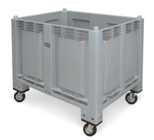 In euromaat. van breukvast polypropyleen in grijs. De opgeslagen goederen zijn door de gesloten wanden beschermd tegen stof en de bak is gemakkelijk te reinigen, met verstevigingsribben. Voor gemakkelijk reinigen is de bodem gesloten. Gemakkelijk te manoeuvreren en verrijden door 4 zwenkwielen. De lekvrije massief rubberen banden zorgen bovendien voor een geluidsarme en trillingsdempende loop. Uitgerust met een doorvoer om door te boren voor een uitloopkraan. De bak is met hefapparaten onderrijd- en transporteerbaar, zodat hij zelfs vol kan worden verplaatst. temperatuurbestendig van -20 °C tot +80 °C.