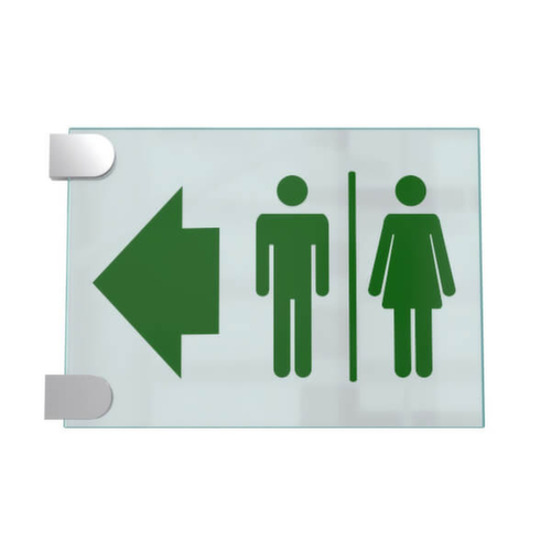 voor binnen. symbool/tekst: wc dames/heren. Richtingwijzer via pijl links.