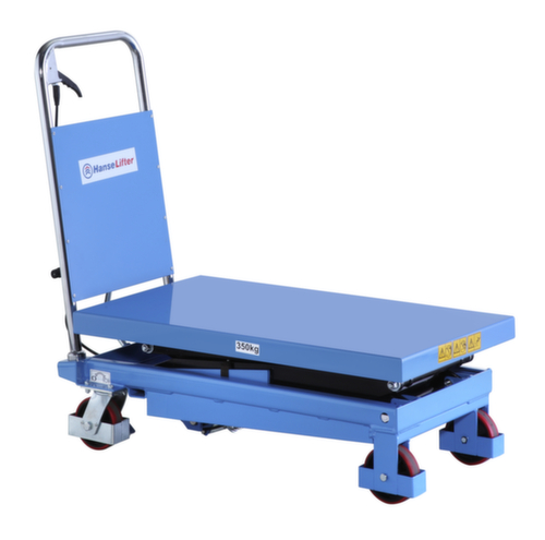 van staal met slag- en krasvaste poedercoating in RAL 5012 lichtblauw. hefuitvoering handmatig met pedaal. dubbele schaar van staal met slag- en krasvaste poedercoating in zwart. torsiebestendige staalconstructie. Met duwbeugel. 2 zwenk- en 2 bokwielen met polyurethaan-banden. remmen op twee zwenkwielen zorgen altijd voor een stevige stand.