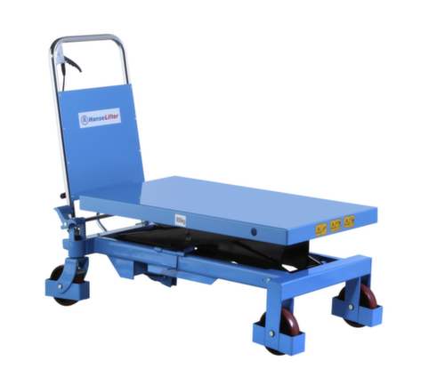 van staal met slag- en krasvaste poedercoating in RAL 5012 lichtblauw. hefuitvoering handmatig met pedaal. enkelvoudige schaar van staal met slag- en krasvaste poedercoating in zwart. torsiebestendige staalconstructie. Met duwbeugel. 2 zwenk- en 2 bokwielen met polyurethaan-banden. remmen op twee zwenkwielen zorgen altijd voor een stevige stand.