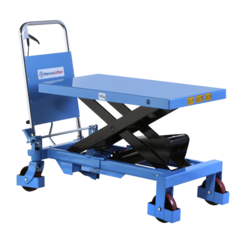 van staal met slag- en krasvaste poedercoating in RAL 5012 lichtblauw. hefuitvoering handmatig met pedaal. enkelvoudige schaar van staal met slag- en krasvaste poedercoating in zwart. torsiebestendige staalconstructie. Met duwbeugel. 2 zwenk- en 2 bokwielen met polyurethaan-banden. remmen op twee zwenkwielen zorgen altijd voor een stevige stand.