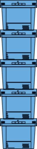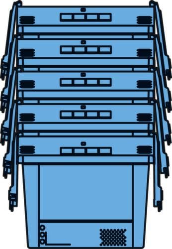 In euromaat. van breukvast polypropyleen in duifblauw. De opgeslagen goederen zijn door de gesloten wanden beschermd tegen stof en de bak is gemakkelijk te reinigen. legbord gesloten. De opgeslagen goederen zijn beschermd tegen stof en vuil door de tweedelige scharnierdeksel. Met open deksel in elkaar stapelbaar. Geschikt voor rollenbanen. temperatuurbestendig van -20 °C tot +80 °C.
