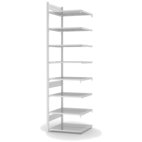 De belangrijkste maten van de hofe van de hofe inhaakstelling in één oogopslag:Op 8 niveau(s) met legborden van plaatstaal / 8 ordnerhoogtes kunt u dossiers, ordners en overig kantoormateriaal optimaal ordenen. niveaus met insteekbare aanslagrand in het midden en legbordrand aan de zijkant van het bovenste vakniveau tegen eruit vallen van ordners. vakhoogtes zijn afhankelijk van het doel en uw behoeften verstelbaar in stappen van 25 mm. gebruik tweezijdig - flexibele opstelling vrijstaand in de ruimte mogelijk. Hoge stabiliteit door stabilisatieliggers. constructie van staal. staanders verzinkt met kunststof coating in RAL7035 lichtgrijs. niveaus verzinkt met kunststof coating in RAL7035 lichtgrijs.
