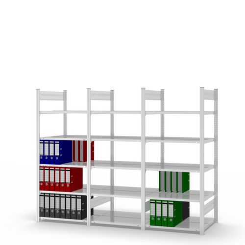 De belangrijkste maten van de hofe van de hofe inhaakstelling in één oogopslag:Op 5 niveau(s) met legborden van plaatstaal / 5 ordnerhoogtes kunt u dossiers, ordners en overig kantoormateriaal optimaal ordenen. niveaus met insteekbare aanslagrand in het midden en legbordrand aan de zijkant van het bovenste vakniveau tegen eruit vallen van ordners. vakhoogtes zijn afhankelijk van het doel en uw behoeften verstelbaar in stappen van 25 mm. gebruik tweezijdig - flexibele opstelling vrijstaand in de ruimte mogelijk. Hoge stabiliteit door stabilisatieliggers. constructie van staal. staanders verzinkt met kunststof coating in RAL7035 lichtgrijs. niveaus verzinkt met kunststof coating in RAL7035 lichtgrijs.