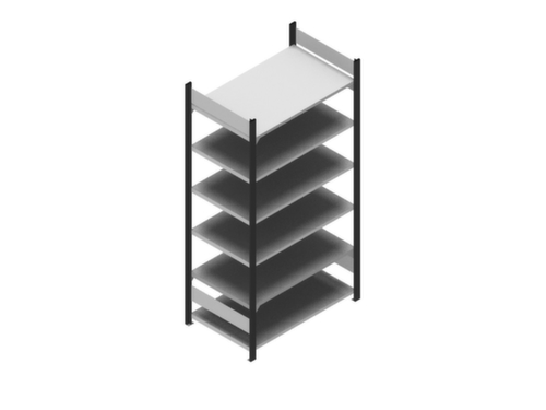 De belangrijkste maten van de hofe van de hofe inhaakstelling in één oogopslag:berg ordners, documenten en ander kantoormateriaal handig op, 6 niveau(s) met legborden van plaatstaal / 5 ordnerhoogtes. deze bieden plaats voor max. 144 ordners. niveaus met insteekbare aanslagrand in het midden en legbordrand aan de zijkant van het bovenste vakniveau tegen eruit vallen van ordners. gebruik tweezijdig - flexibele opstelling vrijstaand in de ruimte mogelijk. Hoge stabiliteit door stabilisatieliggers. constructie van staal. staanders met slijtvaste kunststof coating in RAL7016 antracietgrijs. niveaus met slijtvaste kunststof coating in RAL9006 blank aluminiumkleurig.