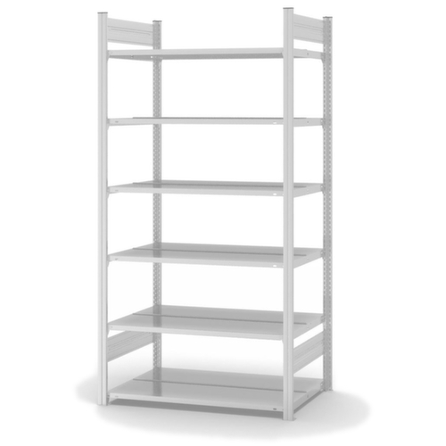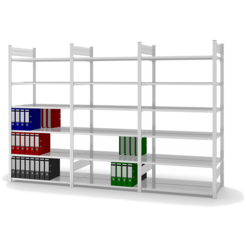 De belangrijkste maten van de hofe van de hofe inhaakstelling in één oogopslag:Op 6 niveau(s) met legborden van plaatstaal / 6 ordnerhoogtes kunt u dossiers, ordners en overig kantoormateriaal optimaal ordenen. niveaus met insteekbare aanslagrand in het midden en legbordrand aan de zijkant van het bovenste vakniveau tegen eruit vallen van ordners. vakhoogtes zijn afhankelijk van het doel en uw behoeften verstelbaar in stappen van 25 mm. gebruik tweezijdig - flexibele opstelling vrijstaand in de ruimte mogelijk. Hoge stabiliteit door stabilisatieliggers. constructie van staal. staanders verzinkt met kunststof coating in RAL7035 lichtgrijs. niveaus verzinkt met kunststof coating in RAL7035 lichtgrijs.