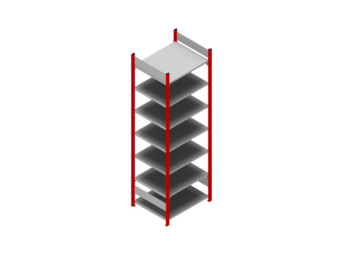 De belangrijkste maten van de hofe van de hofe inhaakstelling in één oogopslag:berg ordners, documenten en ander kantoormateriaal handig op, 7 niveau(s) met legborden van plaatstaal / 6 ordnerhoogtes. deze bieden plaats voor max. 126 ordners. niveaus met insteekbare aanslagrand in het midden en legbordrand aan de zijkant van het bovenste vakniveau tegen eruit vallen van ordners. gebruik tweezijdig - flexibele opstelling vrijstaand in de ruimte mogelijk. Hoge stabiliteit door stabilisatieliggers. constructie van staal. staanders met slijtvaste kunststof coating in RAL3000 vuurrood. niveaus met slijtvaste kunststof coating in RAL9006 blank aluminiumkleurig.