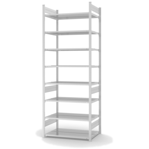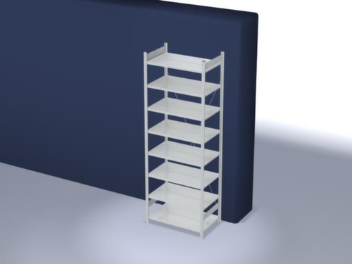 Voor uw veiligheid: volgens DIN EN 15635 moeten legbordstellingen die 4 keer zo hoog zijn als de stellingdiepte (verhouding 4:1) aan de vloer worden bevestigd en geborgd. De aangegeven vaklasten gelden bij een gelijkmatig verdeelde belasting. extra legborden/niveaus zijn leverbaar als accessoire en zijn uit te breiden tot de maximale veldlast.