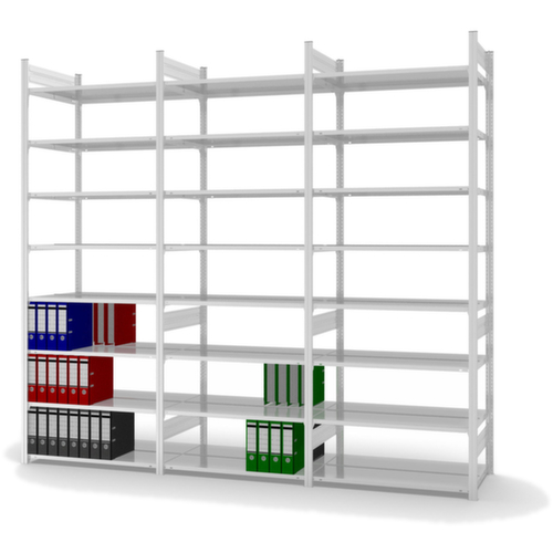 De belangrijkste maten van de hofe van de hofe inhaakstelling in één oogopslag:Op 8 niveau(s) met legborden van plaatstaal / 8 ordnerhoogtes kunt u dossiers, ordners en overig kantoormateriaal optimaal ordenen. niveaus met insteekbare aanslagrand in het midden en legbordrand aan de zijkant van het bovenste vakniveau tegen eruit vallen van ordners. vakhoogtes zijn afhankelijk van het doel en uw behoeften verstelbaar in stappen van 25 mm. gebruik tweezijdig - flexibele opstelling vrijstaand in de ruimte mogelijk. Hoge stabiliteit door stabilisatieliggers. constructie van staal. staanders verzinkt met kunststof coating in RAL7035 lichtgrijs. niveaus verzinkt met kunststof coating in RAL7035 lichtgrijs.