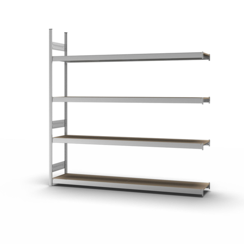 de belangrijkste maten van de hofe breedvakstelling in één oogopslag:4 niveaus met houten vloer. niveaus met versteviging door dwarsprofielen. vakhoogtes zijn afhankelijk van het doel en uw behoeften verstelbaar in stappen van 25 mm. gebruik eenzijdig - ontworpen voor plaatsing tegen een wand. Door gegolfde verbindingsplaten in de diepterichting en stalen voetplaten staat de stelling zeer stevig. De profielafdekkappen bovenaan zorgen voor een nette afwerking. constructie van staal, staanders met corrosiebeschermende zinklaag, traversen met corrosiebeschermende zinklaag.