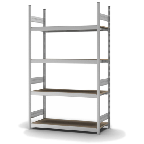 de belangrijkste maten van de hofe breedvakstelling in één oogopslag:4 niveaus met houten vloer. niveaus met versteviging door dwarsprofielen. vakhoogtes zijn afhankelijk van het doel en uw behoeften verstelbaar in stappen van 25 mm. gebruik eenzijdig - ontworpen voor plaatsing tegen een wand. Door gegolfde verbindingsplaten in de diepterichting en stalen voetplaten staat de stelling zeer stevig. De profielafdekkappen bovenaan zorgen voor een nette afwerking. constructie van staal, staanders met corrosiebeschermende zinklaag, traversen met corrosiebeschermende zinklaag.