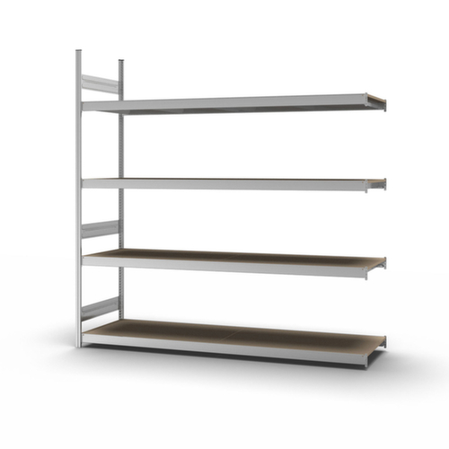 de belangrijkste maten van de hofe breedvakstelling in één oogopslag:4 niveaus met houten vloer. niveaus met versteviging door dwarsprofielen. vakhoogtes zijn afhankelijk van het doel en uw behoeften verstelbaar in stappen van 25 mm. gebruik eenzijdig - ontworpen voor plaatsing tegen een wand. Door gegolfde verbindingsplaten in de diepterichting en stalen voetplaten staat de stelling zeer stevig. De profielafdekkappen bovenaan zorgen voor een nette afwerking. constructie van staal, staanders met corrosiebeschermende zinklaag, traversen met corrosiebeschermende zinklaag.