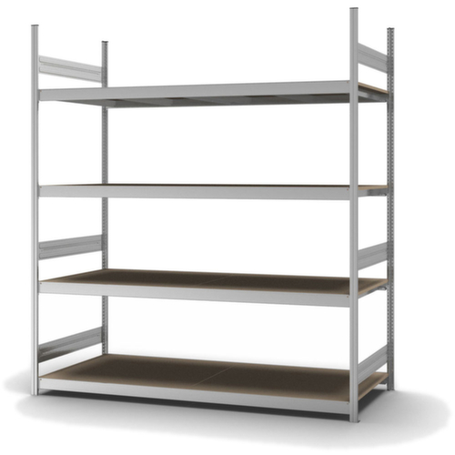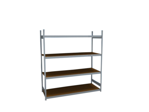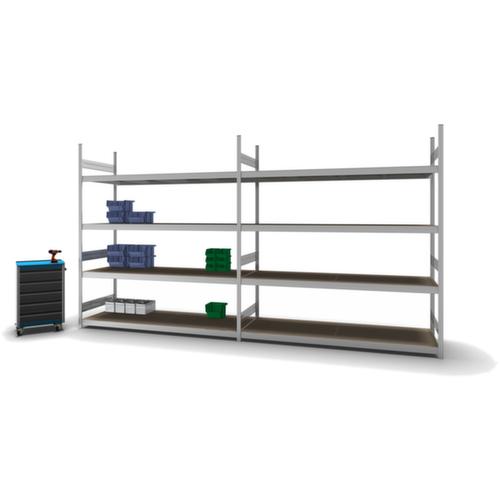 de belangrijkste maten van de hofe breedvakstelling in één oogopslag:4 niveaus met houten vloer. niveaus met versteviging door dwarsprofielen. vakhoogtes zijn afhankelijk van het doel en uw behoeften verstelbaar in stappen van 25 mm. gebruik eenzijdig - ontworpen voor plaatsing tegen een wand. Door gegolfde verbindingsplaten in de diepterichting en stalen voetplaten staat de stelling zeer stevig. De profielafdekkappen bovenaan zorgen voor een nette afwerking. constructie van staal, staanders met corrosiebeschermende zinklaag, traversen met corrosiebeschermende zinklaag.