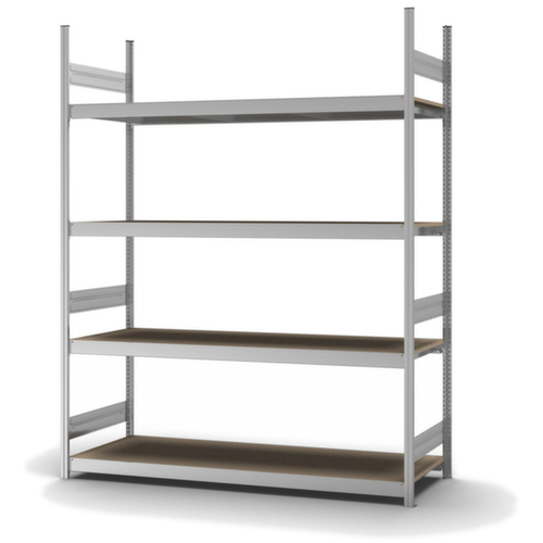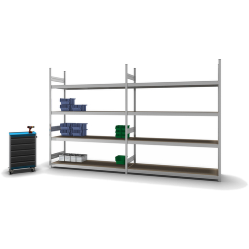 de belangrijkste maten van de hofe breedvakstelling in één oogopslag:4 niveaus met houten vloer. niveaus met versteviging door dwarsprofielen. vakhoogtes zijn afhankelijk van het doel en uw behoeften verstelbaar in stappen van 25 mm. gebruik eenzijdig - ontworpen voor plaatsing tegen een wand. Door gegolfde verbindingsplaten in de diepterichting en stalen voetplaten staat de stelling zeer stevig. De profielafdekkappen bovenaan zorgen voor een nette afwerking. constructie van staal, staanders met corrosiebeschermende zinklaag, traversen met corrosiebeschermende zinklaag.