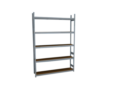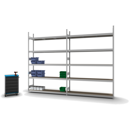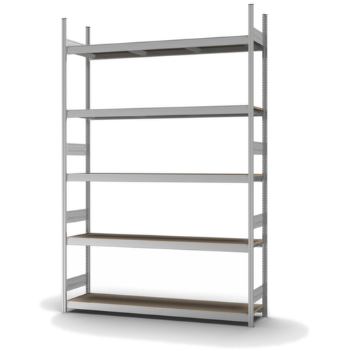 de belangrijkste maten van de hofe breedvakstelling in één oogopslag:5 niveaus met houten vloer. niveaus met versteviging door dwarsprofielen. vakhoogtes zijn afhankelijk van het doel en uw behoeften verstelbaar in stappen van 25 mm. gebruik eenzijdig - ontworpen voor plaatsing tegen een wand. Door gegolfde verbindingsplaten in de diepterichting en stalen voetplaten staat de stelling zeer stevig. De profielafdekkappen bovenaan zorgen voor een nette afwerking. constructie van staal, staanders met corrosiebeschermende zinklaag, traversen met corrosiebeschermende zinklaag.