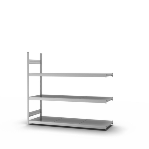de belangrijkste maten van de hofe breedvakstelling in één oogopslag:3 niveaus met Stalen bodem. vakhoogtes zijn afhankelijk van het doel en uw behoeften verstelbaar in stappen van 25 mm. gebruik tweezijdig - flexibele opstelling vrijstaand in de ruimte mogelijk. Door gegolfde verbindingsplaten in de diepterichting en stalen voetplaten staat de stelling zeer stevig. De profielafdekkappen bovenaan zorgen voor een nette afwerking. constructie van staal, staanders met corrosiebeschermende zinklaag, niveaus met corrosiebeschermende zinklaag,