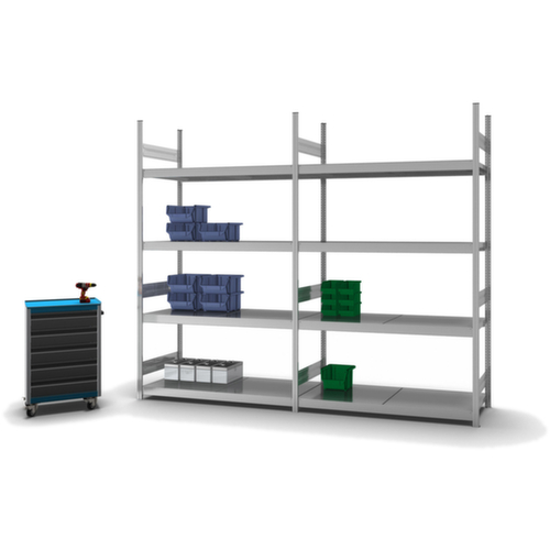 de belangrijkste maten van de hofe breedvakstelling in één oogopslag:4 niveaus met Stalen bodem. vakhoogtes zijn afhankelijk van het doel en uw behoeften verstelbaar in stappen van 25 mm. gebruik tweezijdig - flexibele opstelling vrijstaand in de ruimte mogelijk. Door gegolfde verbindingsplaten in de diepterichting en stalen voetplaten staat de stelling zeer stevig. De profielafdekkappen bovenaan zorgen voor een nette afwerking. constructie van staal, staanders met corrosiebeschermende zinklaag, niveaus met corrosiebeschermende zinklaag,