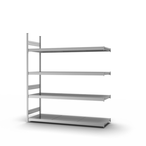 de belangrijkste maten van de hofe breedvakstelling in één oogopslag:4 niveaus met Stalen bodem. vakhoogtes zijn afhankelijk van het doel en uw behoeften verstelbaar in stappen van 25 mm. gebruik tweezijdig - flexibele opstelling vrijstaand in de ruimte mogelijk. Door gegolfde verbindingsplaten in de diepterichting en stalen voetplaten staat de stelling zeer stevig. De profielafdekkappen bovenaan zorgen voor een nette afwerking. constructie van staal, staanders met corrosiebeschermende zinklaag, niveaus met corrosiebeschermende zinklaag,