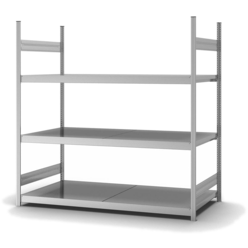 de belangrijkste maten van de hofe breedvakstelling in één oogopslag:3 niveaus met Stalen bodem. vakhoogtes zijn afhankelijk van het doel en uw behoeften verstelbaar in stappen van 25 mm. gebruik tweezijdig - flexibele opstelling vrijstaand in de ruimte mogelijk. Door gegolfde verbindingsplaten in de diepterichting en stalen voetplaten staat de stelling zeer stevig. De profielafdekkappen bovenaan zorgen voor een nette afwerking. constructie van staal, staanders met corrosiebeschermende zinklaag, niveaus met corrosiebeschermende zinklaag,