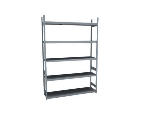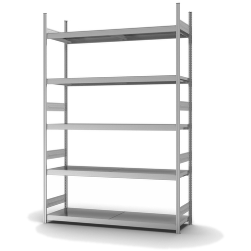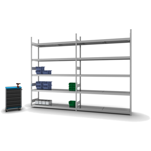 de belangrijkste maten van de hofe breedvakstelling in één oogopslag:5 niveaus met Stalen bodem. vakhoogtes zijn afhankelijk van het doel en uw behoeften verstelbaar in stappen van 25 mm. gebruik tweezijdig - flexibele opstelling vrijstaand in de ruimte mogelijk. Door gegolfde verbindingsplaten in de diepterichting en stalen voetplaten staat de stelling zeer stevig. De profielafdekkappen bovenaan zorgen voor een nette afwerking. constructie van staal, staanders met corrosiebeschermende zinklaag, niveaus met corrosiebeschermende zinklaag,