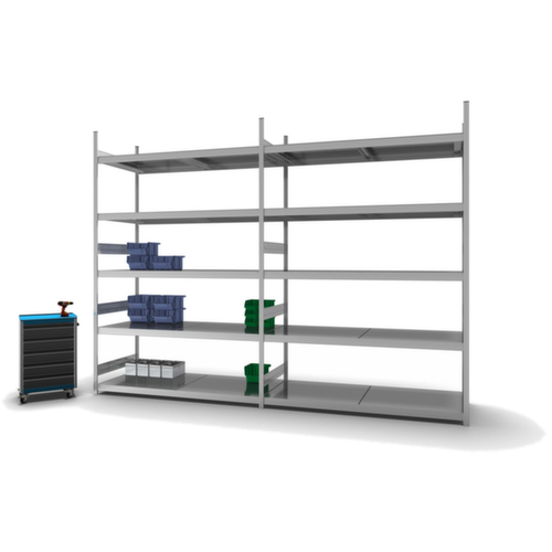 de belangrijkste maten van de hofe breedvakstelling in één oogopslag:5 niveaus met Stalen bodem. vakhoogtes zijn afhankelijk van het doel en uw behoeften verstelbaar in stappen van 25 mm. gebruik tweezijdig - flexibele opstelling vrijstaand in de ruimte mogelijk. Door gegolfde verbindingsplaten in de diepterichting en stalen voetplaten staat de stelling zeer stevig. De profielafdekkappen bovenaan zorgen voor een nette afwerking. constructie van staal, staanders met corrosiebeschermende zinklaag, niveaus met corrosiebeschermende zinklaag,