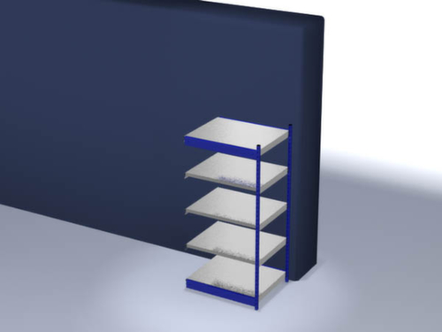de belangrijkste maten van de hofe magazijnstelling in één oogopslag:5 niveaus met Stalen bodem. niveaus met veiligheidsrand voor bescherming tegen verwondingen. 3-voudige veiligheidsrand van 40 mm hoog zorgt voor hoge stabiliteit en bescherming tegen verwondingen. vakhoogtes zijn afhankelijk van het doel en uw behoeften verstelbaar in stappen van 50 mm. opstelhoek recht. gebruik tweezijdig - flexibele opstelling vrijstaand in de ruimte mogelijk. Hoge stabiliteit dankzij lengteliggers. constructie van staal, staanders met slijtvaste kunststof coating in RAL5010 gentiaanblauw, niveaus met corrosiebeschermende zinklaag.