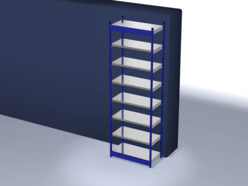 de belangrijkste maten van de hofe magazijnstelling in één oogopslag:7 niveaus met Stalen bodem. niveaus met veiligheidsrand voor bescherming tegen verwondingen. 3-voudige veiligheidsrand van 40 mm hoog zorgt voor hoge stabiliteit en bescherming tegen verwondingen. vakhoogtes zijn afhankelijk van het doel en uw behoeften verstelbaar in stappen van 50 mm. opstelhoek recht. gebruik eenzijdig - ontworpen voor plaatsing tegen een wand. Hoge stabiliteit dankzij lengteliggers. constructie van staal, staanders met slijtvaste kunststof coating in RAL5010 gentiaanblauw, niveaus met corrosiebeschermende zinklaag.