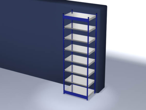 de belangrijkste maten van de hofe magazijnstelling in één oogopslag:7 niveaus met Stalen bodem. niveaus met veiligheidsrand voor bescherming tegen verwondingen. 3-voudige veiligheidsrand van 40 mm hoog zorgt voor hoge stabiliteit en bescherming tegen verwondingen. vakhoogtes zijn afhankelijk van het doel en uw behoeften verstelbaar in stappen van 50 mm. opstelhoek recht. gebruik eenzijdig - ontworpen voor plaatsing tegen een wand. Hoge stabiliteit dankzij lengteliggers. constructie van staal, staanders met slijtvaste kunststof coating in RAL5010 gentiaanblauw, niveaus met corrosiebeschermende zinklaag.