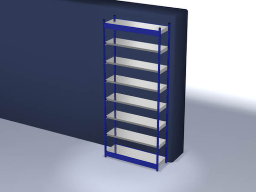 de belangrijkste maten van de hofe magazijnstelling in één oogopslag:7 niveaus met Stalen bodem. niveaus met veiligheidsrand voor bescherming tegen verwondingen. 3-voudige veiligheidsrand van 40 mm hoog zorgt voor hoge stabiliteit en bescherming tegen verwondingen. vakhoogtes zijn afhankelijk van het doel en uw behoeften verstelbaar in stappen van 50 mm. opstelhoek recht. gebruik eenzijdig - ontworpen voor plaatsing tegen een wand. Hoge stabiliteit dankzij lengteliggers. constructie van staal, staanders met slijtvaste kunststof coating in RAL5010 gentiaanblauw, niveaus met corrosiebeschermende zinklaag.