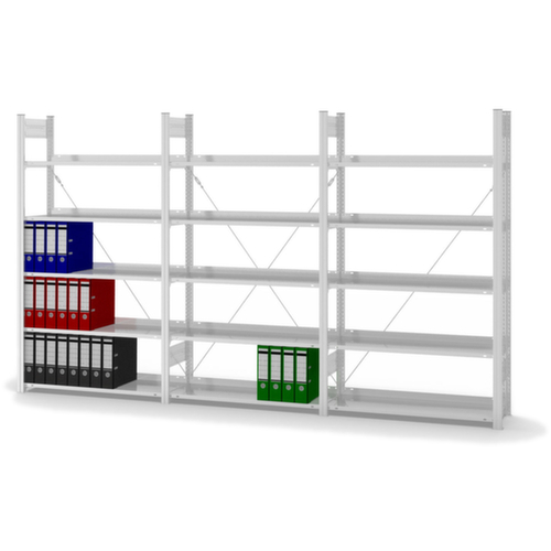 De belangrijkste maten van de hofe van de hofe inhaakstelling in één oogopslag:Op 5 niveau(s) met legborden van plaatstaal / 5 ordnerhoogtes kunt u dossiers, ordners en overig kantoormateriaal optimaal ordenen. niveaus met aanslagrand en legbordrand aan de zijkant van het bovenste vakniveau tegen eruit vallen van ordners. vakhoogtes zijn afhankelijk van het doel en uw behoeften verstelbaar in stappen van 25 mm. gebruik eenzijdig - ontworpen voor plaatsing tegen een wand. Hoge stabiliteit door diagonaalschoren. constructie van staal. staanders verzinkt met kunststof coating in RAL7035 lichtgrijs. niveaus verzinkt met kunststof coating in RAL7035 lichtgrijs.