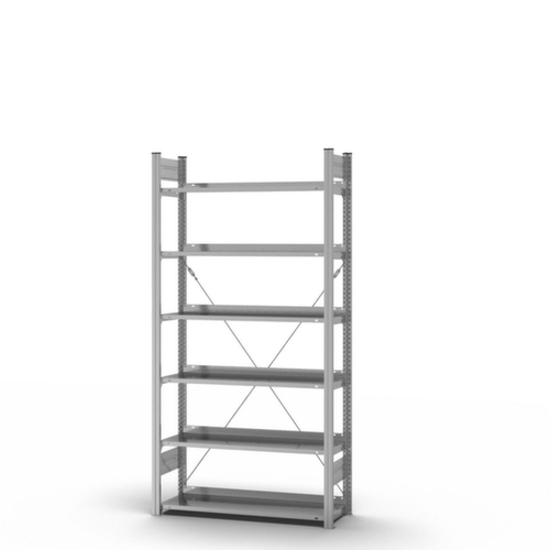 Voor uw veiligheid: volgens DIN EN 15635 moeten legbordstellingen die 4 keer zo hoog zijn als de stellingdiepte (verhouding 4:1) aan de vloer worden bevestigd en geborgd. De aangegeven vaklasten gelden bij een gelijkmatig verdeelde belasting. extra legborden/niveaus zijn leverbaar als accessoire en zijn uit te breiden tot de maximale veldlast.