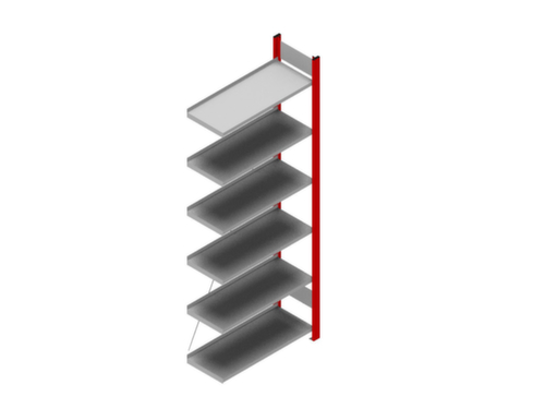 De belangrijkste maten van de hofe van de hofe inhaakstelling in één oogopslag:berg ordners, documenten en ander kantoormateriaal handig op, 6 niveau(s) met legborden van plaatstaal / 5 ordnerhoogtes. deze bieden plaats voor max. 54 ordners. niveaus met aanslagrand en legbordrand aan de zijkant van het bovenste vakniveau tegen eruit vallen van ordners. gebruik eenzijdig - ontworpen voor plaatsing tegen een wand. Hoge stabiliteit door diagonaalschoren. constructie van staal. staanders met slijtvaste kunststof coating in RAL3000 vuurrood. niveaus met slijtvaste kunststof coating in RAL9006 blank aluminiumkleurig.