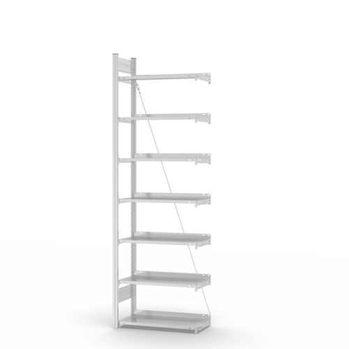 De belangrijkste maten van de hofe van de hofe inhaakstelling in één oogopslag:Op 7 niveau(s) met legborden van plaatstaal / 7 ordnerhoogtes kunt u dossiers, ordners en overig kantoormateriaal optimaal ordenen. niveaus met aanslagrand en legbordrand aan de zijkant van het bovenste vakniveau tegen eruit vallen van ordners. vakhoogtes zijn afhankelijk van het doel en uw behoeften verstelbaar in stappen van 25 mm. gebruik eenzijdig - ontworpen voor plaatsing tegen een wand. Hoge stabiliteit door diagonaalschoren. constructie van staal. staanders verzinkt met kunststof coating in RAL7035 lichtgrijs. niveaus verzinkt met kunststof coating in RAL7035 lichtgrijs.
