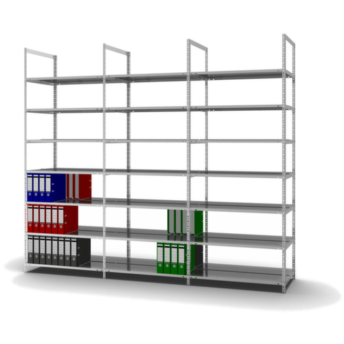 De belangrijkste maten van de hofe dossierstelling in één oogopslag:7 niveau(s) met legborden van hoogwaardig dun plaatstaal, zonder afdeklegbord / 7 ordnerhoogtes voor 84 ordners. niveaus met insteekbare middelste aanslagrand en legbordrand aan de zijkanten van het bovenste legbord (zonder extra spijlen), zorgt ervoor dat de ordners er niet uitvallen en geeft tegelijkertijd stabiliteit in de lengte- en diepterichting. De veiligheidsrand beschermt ook tegen verwonding bij het grijpen in de stelling. gebruik tweezijdig - flexibele opstelling vrijstaand in de ruimte mogelijk. constructie van staal, staanders met corrosiebeschermende zinklaag, niveaus met corrosiebeschermende zinklaag.