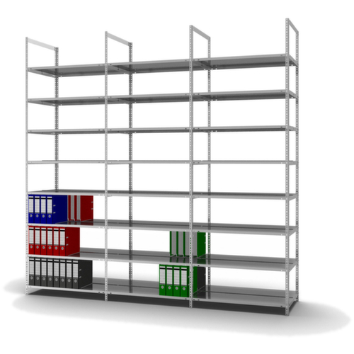 De belangrijkste maten van de hofe dossierstelling in één oogopslag:8 niveau(s) met legborden van hoogwaardig dun plaatstaal, zonder afdeklegbord / 8 ordnerhoogtes voor 96 ordners. niveaus met insteekbare middelste aanslagrand en legbordrand aan de zijkanten van het bovenste legbord (zonder extra spijlen), zorgt ervoor dat de ordners er niet uitvallen en geeft tegelijkertijd stabiliteit in de lengte- en diepterichting. De veiligheidsrand beschermt ook tegen verwonding bij het grijpen in de stelling. gebruik tweezijdig - flexibele opstelling vrijstaand in de ruimte mogelijk. constructie van staal, staanders met corrosiebeschermende zinklaag, niveaus met corrosiebeschermende zinklaag.